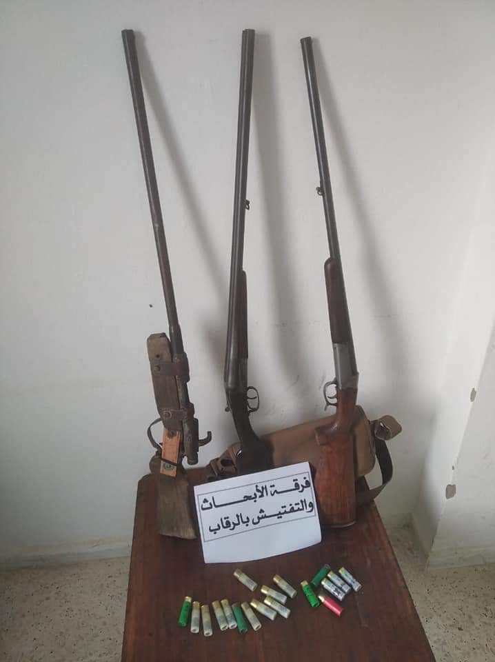 قامت فرقة الأبحاث والتفتيش بمنطقة الحرس الوطني بالرقاب اليوم وبالتنسيق مع النيابة العمومية وفوج التدخل و طلائع الحرس الوطني بسيدي بوزيد لمداهمة منازل عدد الأشخاص بجهتي الرڨاب ومنزل بوزيان و تم حجز عدد 03 بنادق صيد عيار 16 مم نوع saint étienne، بندقية تقليدية الصنع و أخرى ذات فوهة واحدة و مجموعة من الخراطيش.