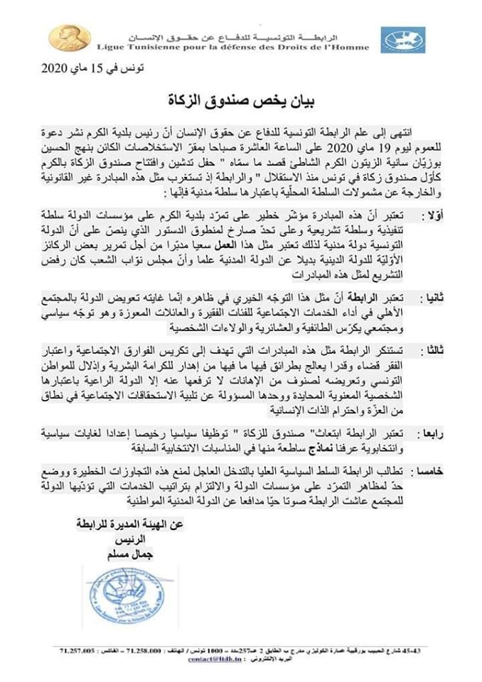 أخبار وطنية الرابطة التونسية للدفاع عن حقوق الإنسان تدعو السلط السياسية لمنع انشاء صندوق زكاة ببلدية الكرم وتصدر البيان التالي