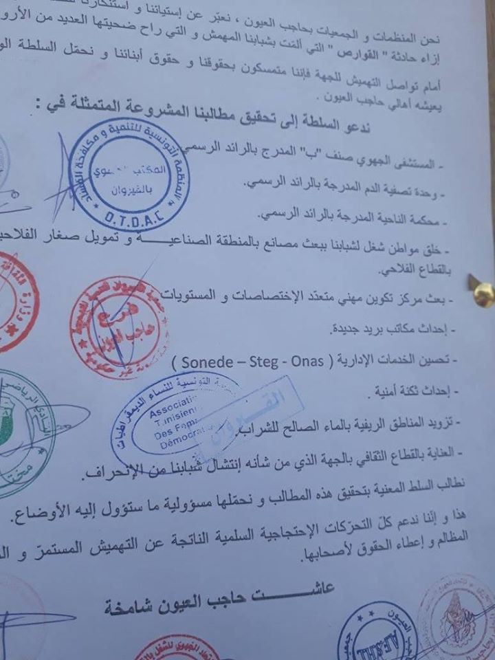 وهذه هي قائمة المطالب التي رفعها المحتجون للسلط ومنها انشاء مستشفى جهوي صنف "ب" ووحدة تصفية الدم ومحكمة وبعث مصانع بالجهة ومركز تكوين مهني فضلا عن العناية بالقطاع الثقافي الذي من شأنه انتشال الشباب من الانحراف وغيرها: