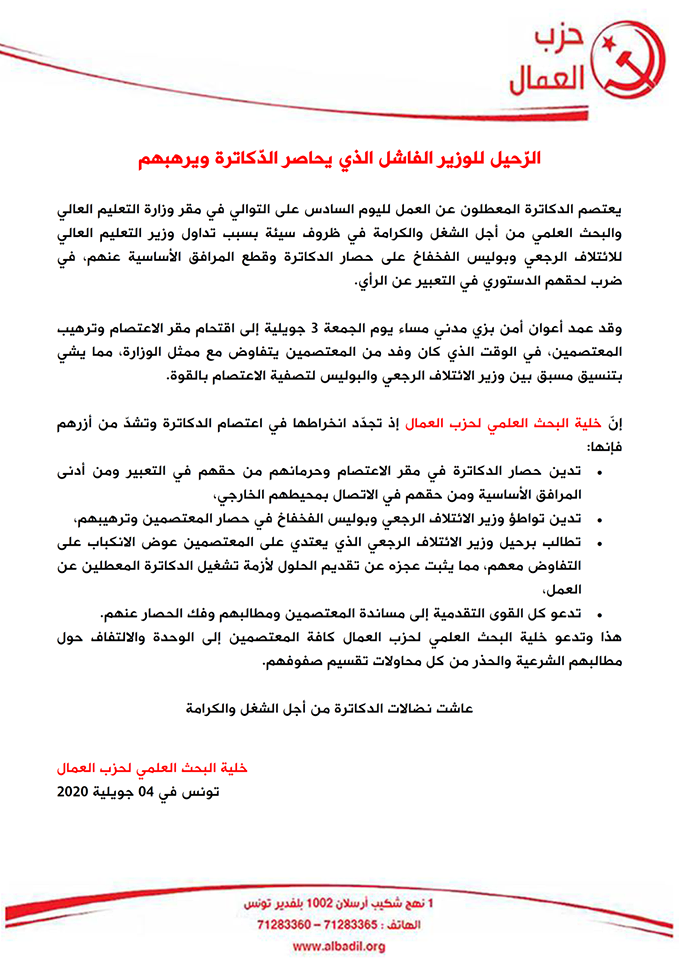 هذا وتدعو خلية البحث العلمي لحزب العمال كافة المعتصمين إلى الوحدة والالتفاف حول مطالبهم الشرعية والحذر من كل محاولات تقسيم صفوفهم.