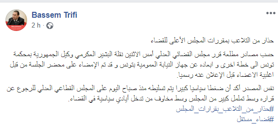 حذّر عضو الرابطة التونسية للدفاع عن حقوق الإنسان بسام الطريفي من التلاعب بمقررات المجلس الأعلى للقضاء، وأكدّ أنه ووفقا لمصادر مطلعة فقد قرر مجلس القضائي العدلي أمس الاثنين نقلة البشير العكرمي وكيل الجمهورية بمحكمة تونس الى خطة اخرى وابعاده عن جهاز النيابة العمومية بتونس و قد تم الإمضاء على محضر الجلسة من قبل اغلبية الاعضاء قبل الإعلان عنه رسميا.