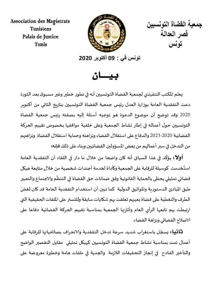 أخبار وطنية بعد استجواب رئيسها من قبل التفقدية العامة بوزارة العدل: جمعية القضاة التونسيين تحذر وتصدر البيان التالي