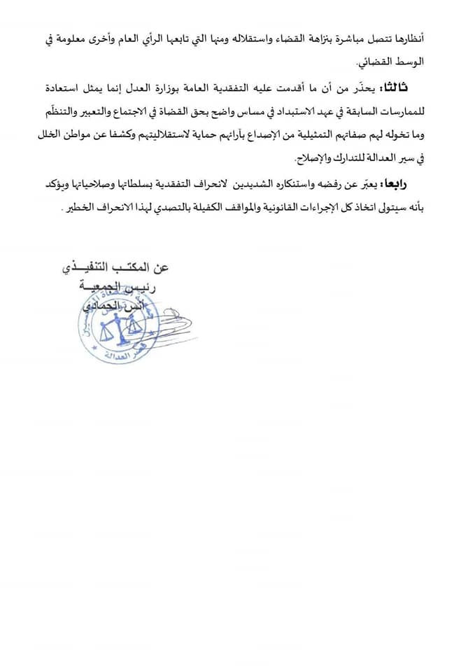 وحذرت الجمعية من استعادة ممارسات عهد الاستبداد في مساس واضح بحق القضاة في التنظم والاجتماع والتعبير معتبرة ان في هذا الاستدعاء انحراف للتفقدية في صلاحياتها.