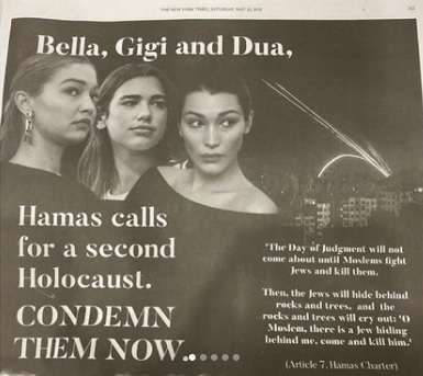 ورُبط اسم بيلا وشقيقتها جيجي حديد ودوا ليبا مؤخراً بحركة حماس وذلك خلال إعلان نشر في صحيفة نيويورك لمهاجمتهن إسرائيل بسبب الأعمال الوحشية التي يتعرض لها الشعب الفلسطيني.