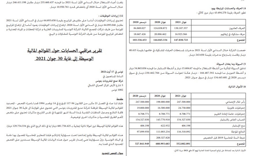 نشرت شركة صنع المشروبات بتونس (SFBT) القوائم المالية الوسيطة الخاصة بها الى غاية 30 جوان 2021.