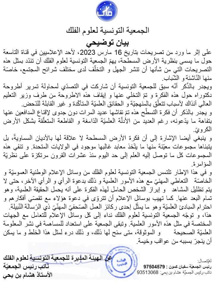 ردا على ما صدر على لسان الصحفي اشرف الكعلي في احد البرامج التلفزية من أن الارض مسطحة الشكل، أصدرت الجمعية التونسية لعلوم الفلك بيانا توضيحيا نددت فيه بمثل هذا التصريح الذي من شأنه ان ينشر الجهل والتخلف في صفوف المجتمع باعتبار كروية الارض. وورد في بيان الجمعية ما يلي:
