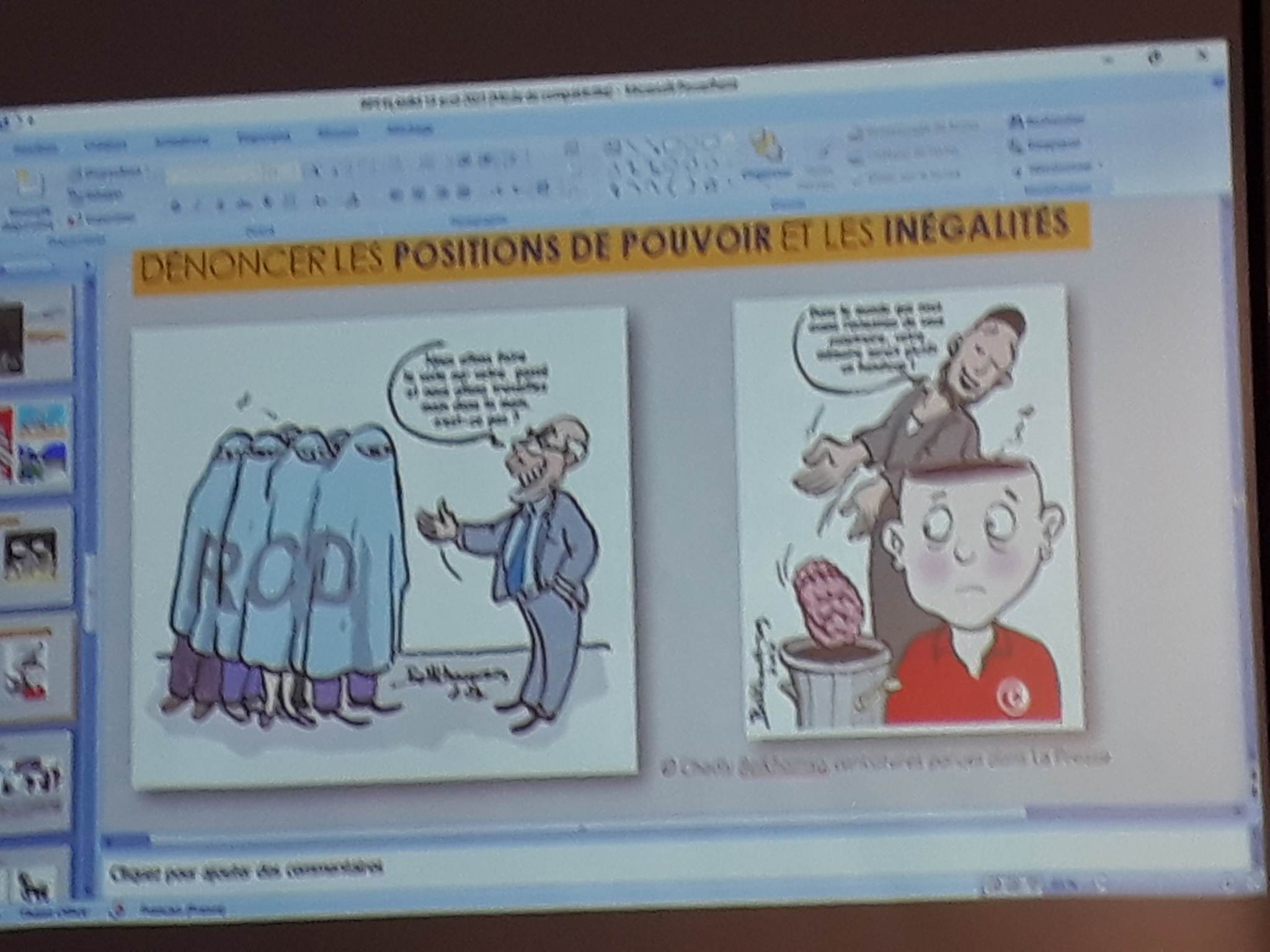 A côté du cinéma, l’historienne s’est appuyée sur d’autres formes d’expression artistique qui permettent une autre lecture de l’histoire. Parmi ces expressions, le dessin satirique qui, comme on était un pays de censure, était très timide, alors que maintenant il devient franchement politique. Kmar Ben Dana attire l’attention que « là aussi, c’est un changement. Des gens naissent dans une société dans laquelle le dessin satirique est politique. Le gosse qui est né en 2010, personne ne peut lui enlever ça de la tête. Il est né là-dedans ».