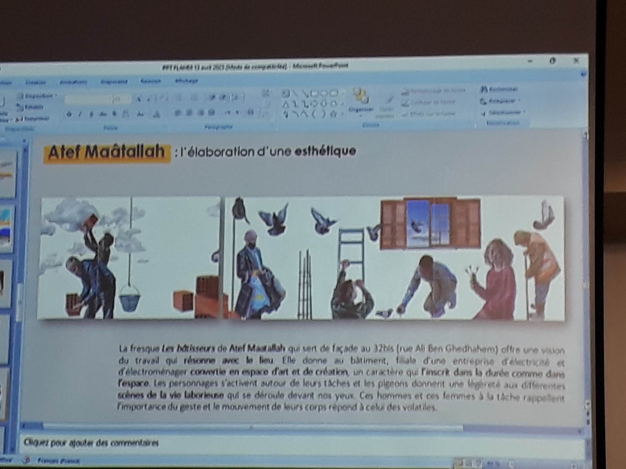Un autre exemple est donné par la conférencière, celui de l’artiste Atef Maatallah qui travaille sur l’esthétique de la crise politique. « Je crois que Maatallah est quelqu’un qui arrive à engranger ses soucis éthiques et esthétiques. Il faut aller visiter le fronton de la galerie « 32, bis » dans lequel il parle des inégalités sociales et de tous les travailleurs invisibles de la société. Très belle œuvre, tous ces travailleurs invisibles pendant le Covid, il les a mis en fronton d’un centre d’art. Et c’est un hommage aux travailleurs manuels et au travail invisible et invisibilisé. Il y a aussi ce dessin du même artiste sur la statue de Bourguiba, C’est une sorte de subversion de l’image, c’est d’une dérision et d’une beauté. Bourguiba est un grand personnage mais faut savoir s’en moquer aussi. Il faut savoir se moquer des grands personnages. Une société doit pouvoir le faire, ils sont dans la postérité mais avec un côté critique. Atef Maatallah l’a fait ».
