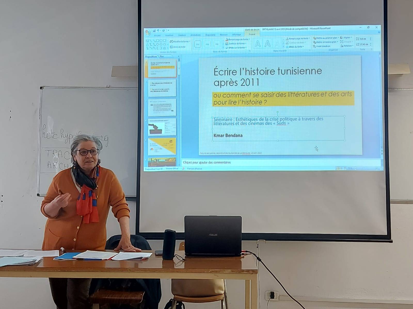 La conférence donnée par l’historienne Kmar Ben Dana à l’université de la Manouba sur la lecture de l’histoire tunisienne après 2011 à travers les arts, la littérature et le cinéma fut une occasion durant laquelle l’historienne est revenue sur un certain nombre de questions afférentes au rôle de l’université en tant que producteur de connaissance, au rôle de l’historien et de sa fonction critique dans la société ainsi que celui de l’histoire.