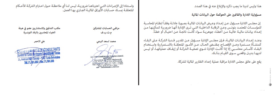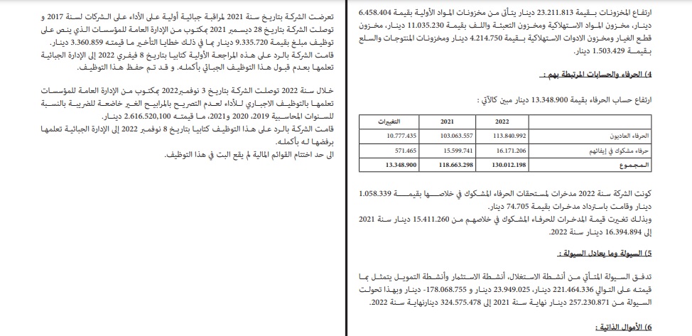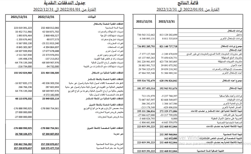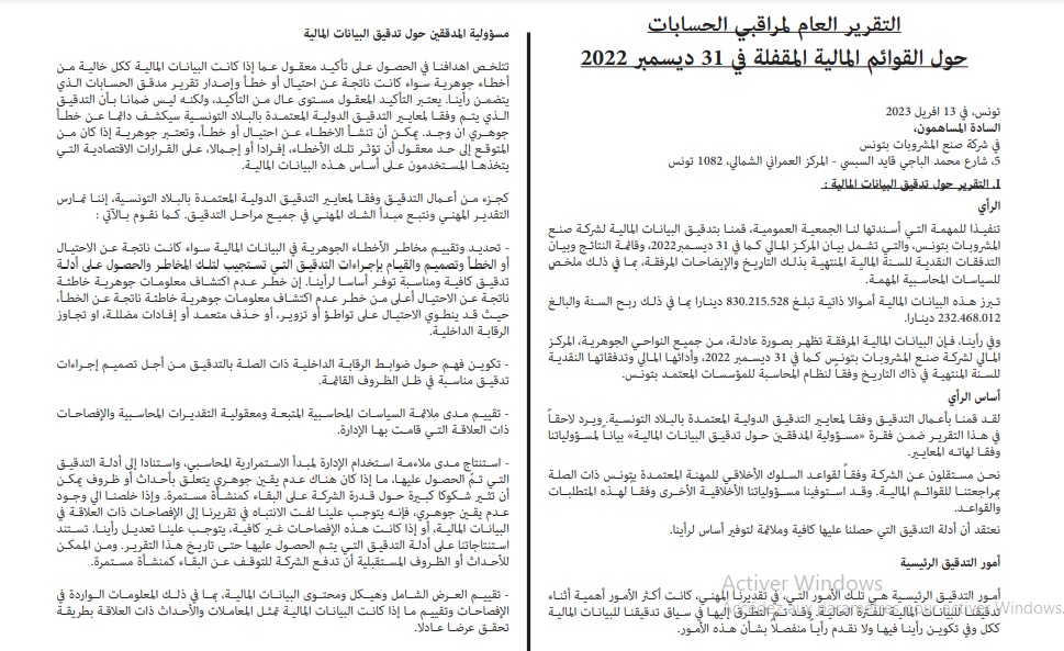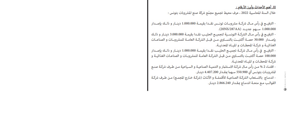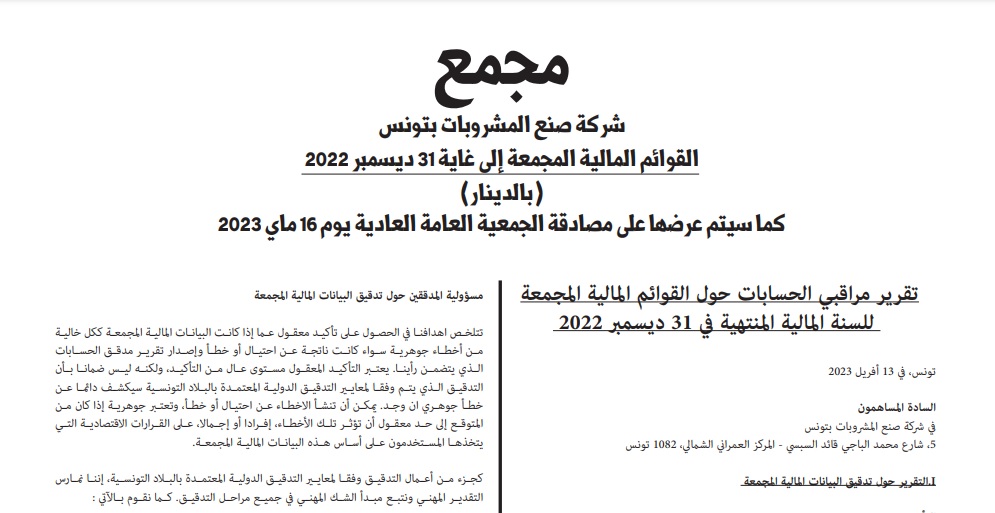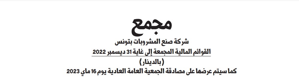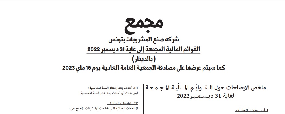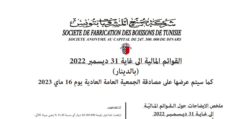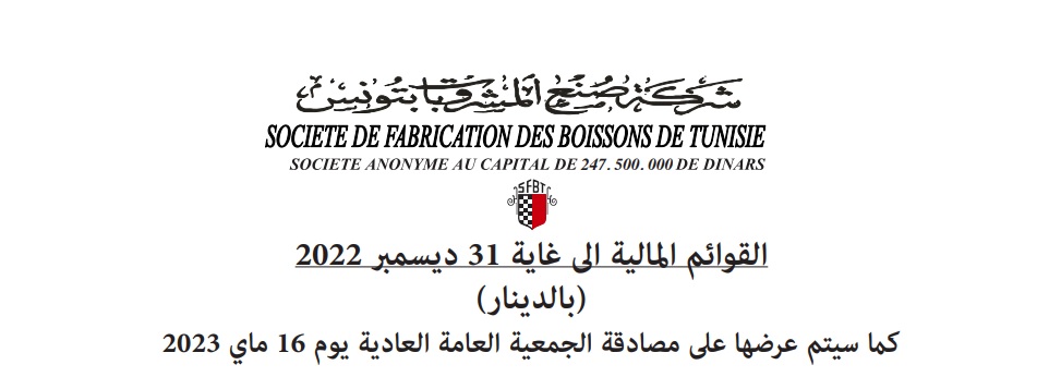 نشرت شركة صنع المشروبات بتونس (SFBT) القائمات المالية الخاصة بها الى غاية 31 ديسمبر 2022 كما سيتم عرضها على مصادقة الجمعية العامة العادية يوم 16 ماي 2023. كما نشرت القائمات المالية للمجمع الى غاية 31 ديسمبر 2022 كما سيتم عرضها على مصادقة الجمعية العامة العادية يوم 16 ماي 2023.