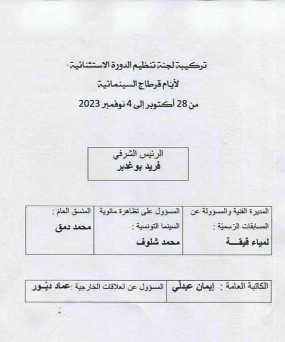 أعلنت وزارة الثقافة عن تركيبة لجنة تنظيم الدورة القادمة لأيام قرطاج السينمائية والتي ستنتظم من 28 اكتوبر الى 4 نوفمبر 2023، بتسمية فريد بوغدير مديرا شرفيا ولمياء قيقة مديرة فنية ومحمد شلوف مسؤولا عن تظاهرة مئوية السينما التونسية ومحمد دمق منسقا عاما.