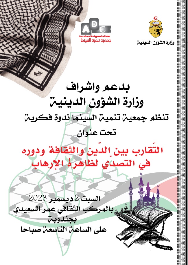 بدعم واشراف وزارة الشؤون الدينية تنظّم جمعية تنمية السينما يوم 2 ديسمبر القادم بفضاء المركّب الثقافي "عمر السعيدي" بجندوبة ندوة فكرية بعنوان"التقارب بين الدين والثقافة ودوره في التصدّي لظاهرة الارهاب".