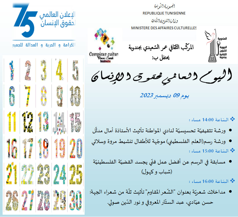 ويوم 9 ديسمبر الجاري تنتظم ندوة بعنوان"أين القضية الفلسطينيّة من الإعلان العالمي العالمي لحقوق الإنسان؟" لتبحث في قضايا التهجير التّهجير التّجهير و الإبادة والأطفال و الصراعات المسلّحة"وهي من تأثيث جمعيّة المحامين الشبان، الفرع الجهوي للمحامين بجندوبة والفرع الجهوي بجندوبة لرابطة حقوق الإنسان ثم تنتظم ورشة تثقيفيّة تحسيسيّة لنادي المواطنة بالمركّب الثقافي ومن تأثيث الأستاذة أمال مدلّل ثم تنتظم ورشة رسم"العلم الفلسطيني"وهي ورشة موجّهة للأطفال ومن تنشيط مروة وسلاتي.