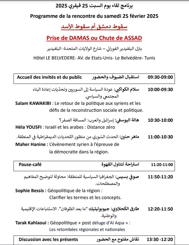 أخبار وطنية يوم السبت 25 جانفي: لقاء بعنوان: سقوط دمشق أم سقوط الأسد؟ من تنظيم جمعية نشاز