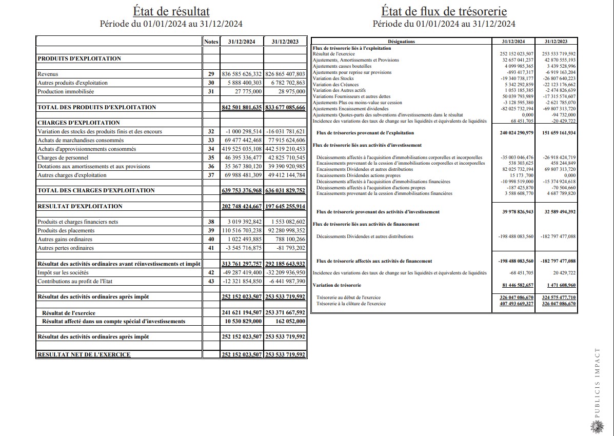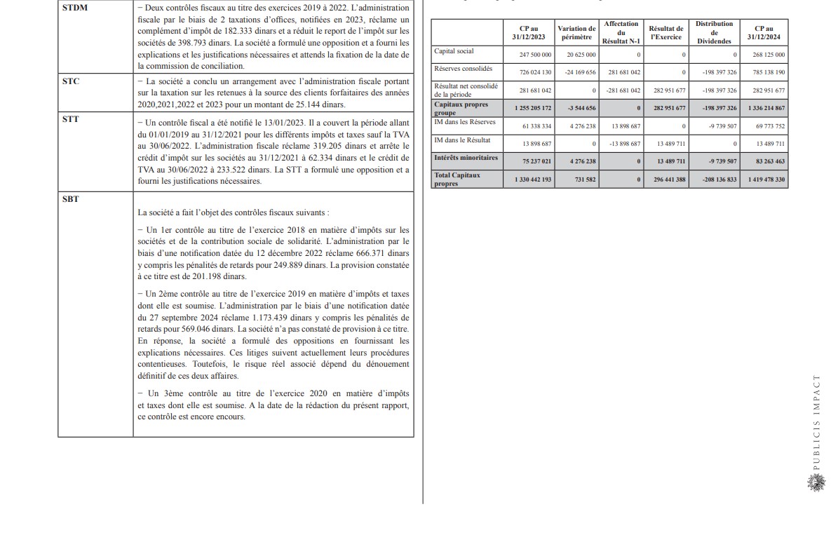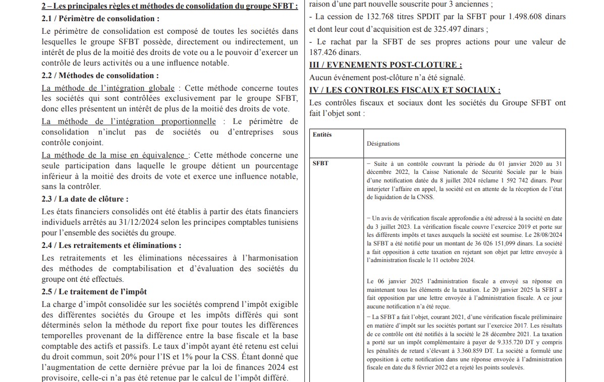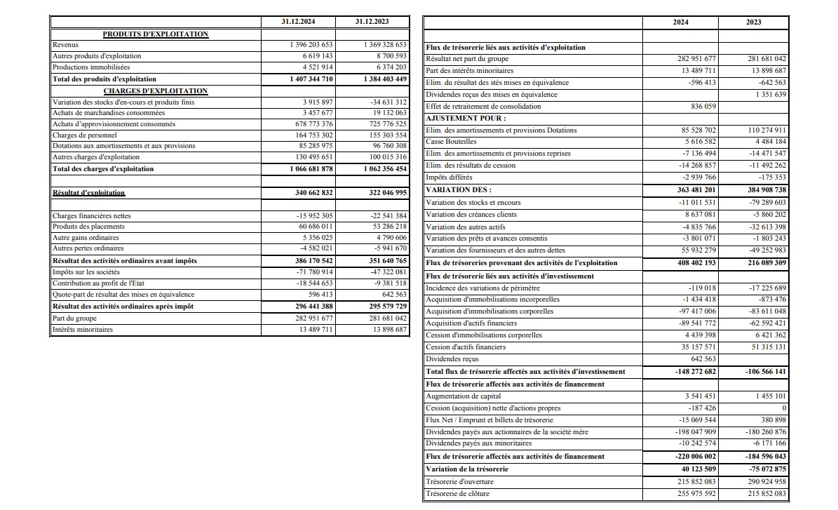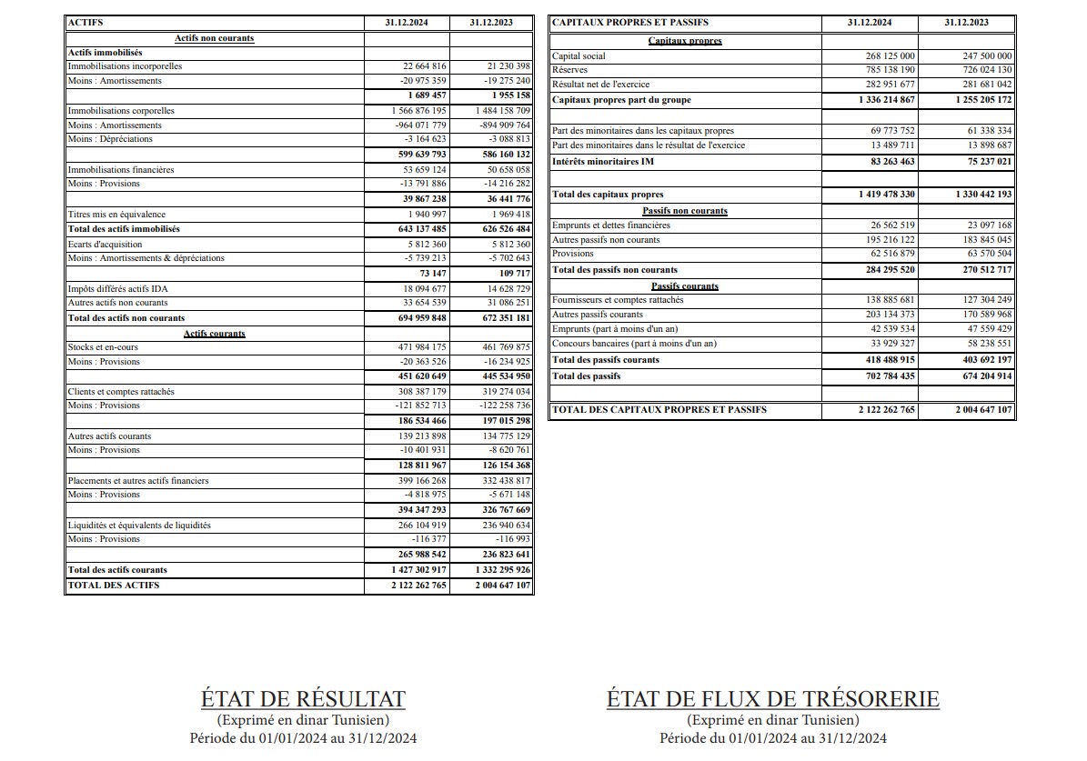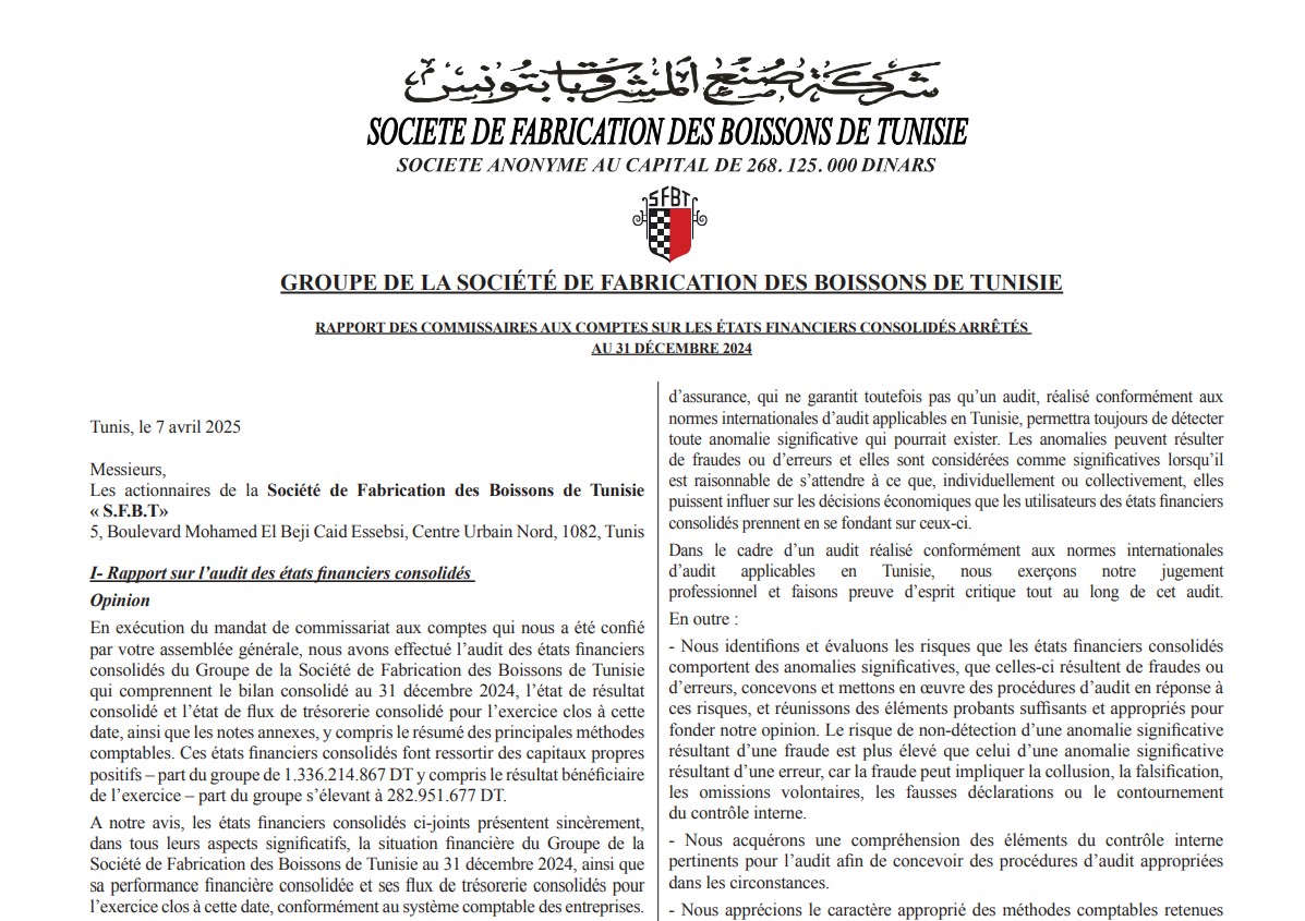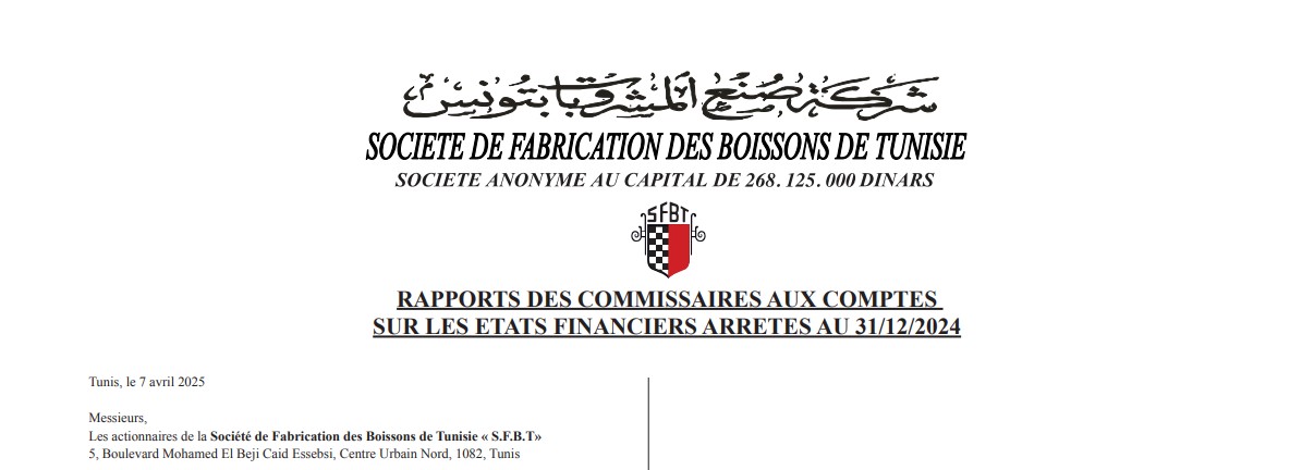نشرت شركة صنع المشروبات بتونس (SFBT) قائماتها المالية الى غاية 31 ديسمبر 2024 وايضا قائماتها المالية الموحدة الى غاية 31 ديسمبر 2024 .