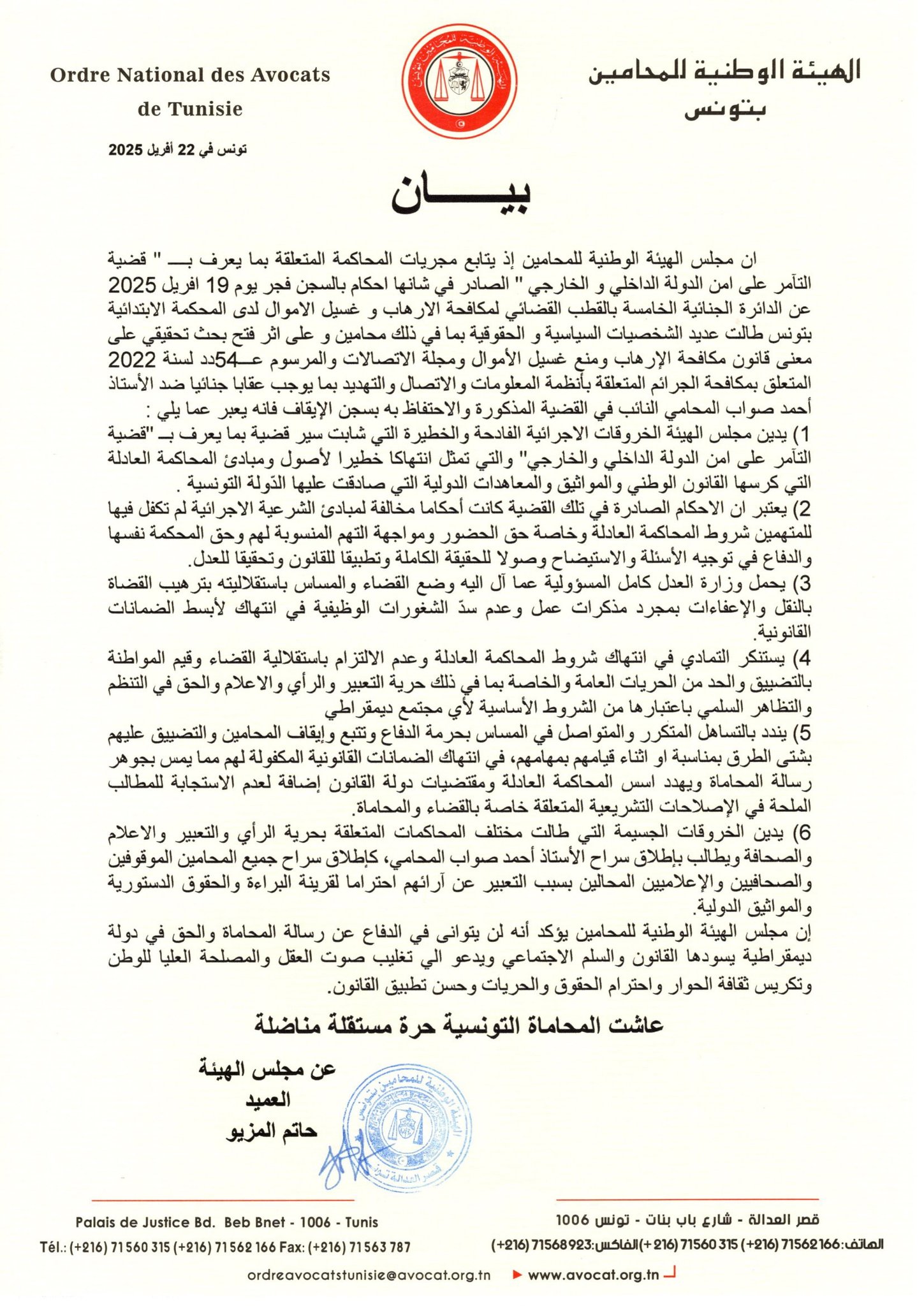 طالب مجلس الهيئة الوطنية للمحامين في بيان اصدره منذ حين بإطلاق سراح المحامي أحمد صواب الذي تمّ الاحتفاظ به يوم أمس، وكافة المحامين الموقوفين، بالإضافة إلى الصحافيين والإعلاميين الذين تمّت إحالتهم بسبب "التعبير عن آرائهم"، وذلك "احتراما لقرينة البراءة وللحقوق الدستورية والمواثيق الدولية". ودعا المجلس في بيان أصدره اليوم الثلاثاء، إلى "تغليب صوت العقل والمصلحة العليا للوطن، وتكريس ثقافة الحوار، مع احترام الحقوق والحريات، وحسن تطبيق القانون".