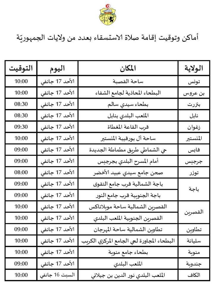 أصدرت وزارة الشؤون الدينية اليوم الجمعة 15 جانفي 2016 بيانا أعلنت فيه عن أماكن وتوقيت صلاة الاستسقاء بعدد من ولايات الجمهورية وفيما يلي التوقيت والأماكن:
