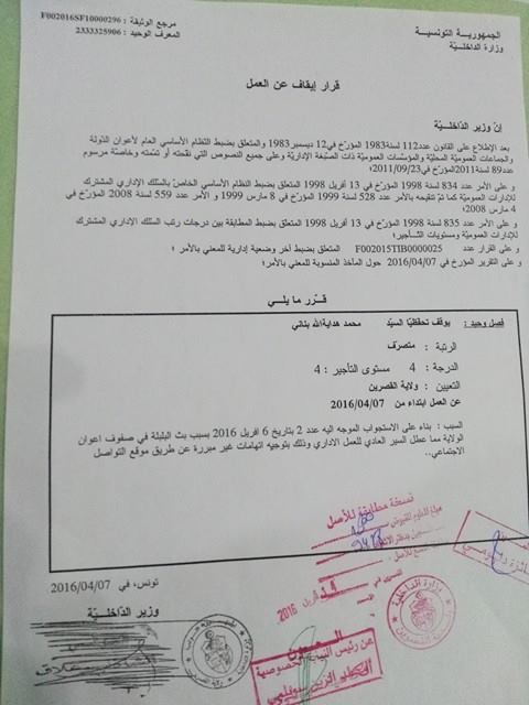 قرّر والي القصرين خلال هذه الأيام بإصدار قرار بإيقاف موظف بمقر الولاية بعد استجوابه وذلك بسبب تدوينة فايسبوكية نشرها ضدّ احد الأشخاص، في حين قام 65 عاملا وموظفا بنفس الولاية في تقديم شكاية في شأنه لدى فرقة الأبحاث والتفتيش بالجهة التي استمعت لأقوالهم في ما سيتم غدا الثلاثاء الاستماع إلى أقوال الموظف المتهم.