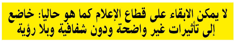 غير أن ذلك لا يكفي لأنّ الهيئة تغطي المجال السمعي البصري وحده وتبقى الصحافة المكتوبة والالكترونية وتبقى كذلك وكالة الأنباء وتبقى وضعية الصحفيين وتبقى اقتصاديات الاعلام ومنها قضية الإشهار العمومي، تبقى كلها ملفات بدون اشراف وغير معقول أن لا يوجد من يتولى معالجة هذه الملفات وهناك تخل من قبل هذه الحكومة على مسؤوليتها الدستورية والتي هي مطالبة بالقيام بها بمقتضى الدستور.