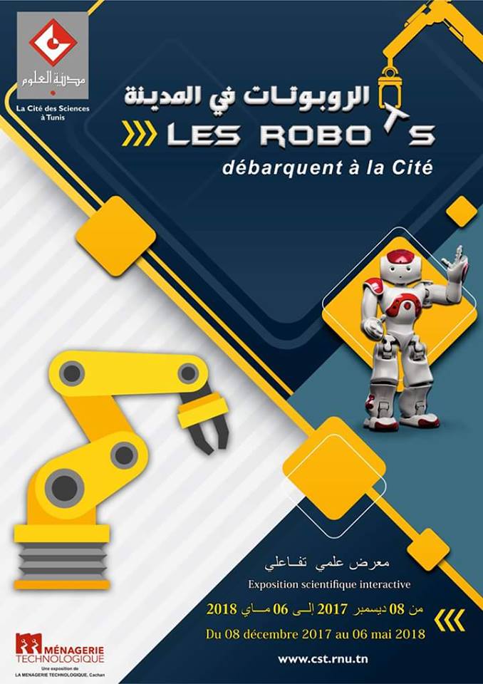 تحتضن مدينة العلوم من 8 ديسمبر 2017 الى 6 ماي 2018 معرض علمي تفاعلي جديد "الروبوتات في المدينة". ولإزالة الغموض الذي يحوم حول عالم الروبوتات، وهو عالم يشهد تطوّرا مستمرّا، تدعوكم مدينة العلوم بتونس لاستكشاف المعرض العلمي المؤقت الجديد الذي يتكوّن من 6 روبوتات تفاعليّة و تعليميّة.