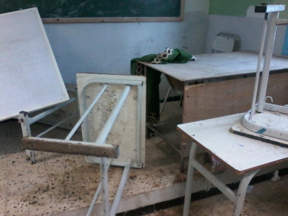 مرّة أخرى تتعرّض مدرسة اليمامة بسيدي عمر رواد (عن ولاية أريانة) الى اعتداء صارخ حيث عمد بعض المنحرفين ليلة أمس الى اقتحام المدرسة وخلع أبواب الأقسام وإقامة جلسة خمرية واستعمال (Colle fort) ثم تكسير معدّات القسم من طاولات وكراسي وحتى السبّورة واللافتات المعلّقة على الحائط...