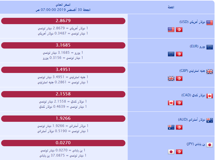 اقتصاد سعر صرف الدينار التونسي مقابل الدولار والأورو لهذا اليوم