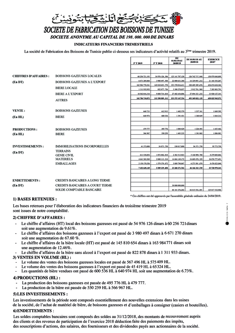 نشرت شركة صنع المشروبات بتونس القوائم المالية الخاصة بها بالنسبة للثلاثي الثالث لسنة 2019 بالدينار..