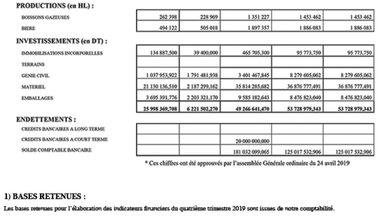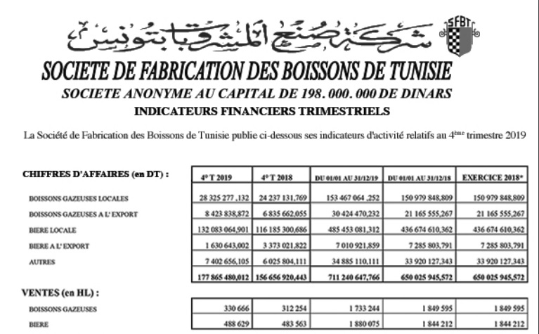 نشرت شركة صنع المشروبات بتونس (SFBT) القوائم المالية الخاصة بها بالنسبة للثلاثي الرابع لسنة 2019 بالدينار.