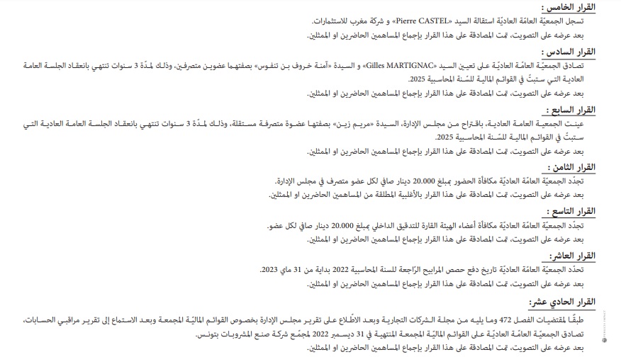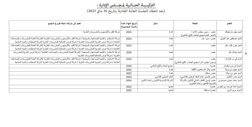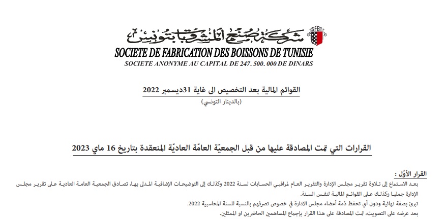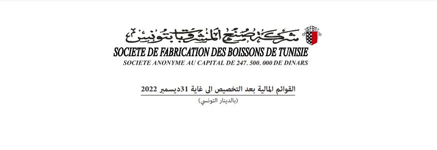نشرت شركة صنع المشروبات بتونس (SFBT) قائماتها المالية بعد التخصيص الى غاية 31 ديسمبر 2022 بالدينار التونسي.
