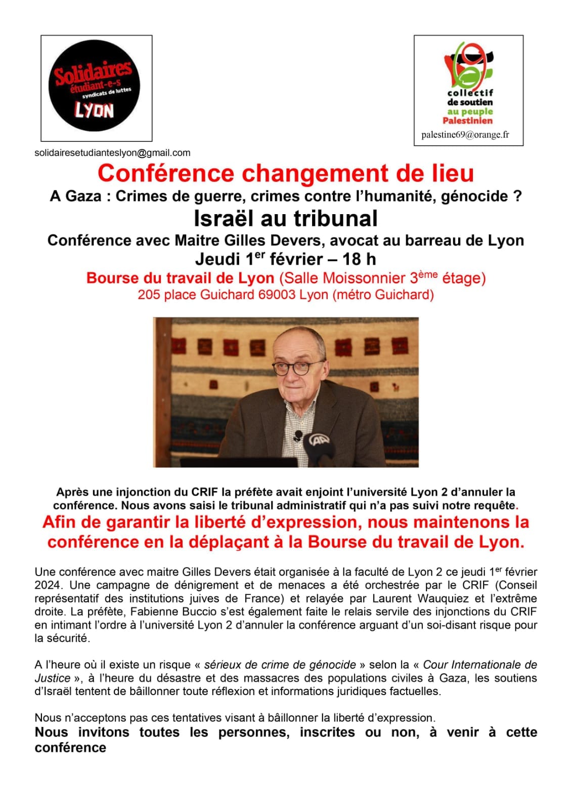 Suite à une demande faite par le Conseil représentatif des institutions juives de France (Crif) pour interdire une conférence organisée par le syndicat étudiant Solidaires et le collectif Palestine69, intitulée « Crimes de guerre, crimes contre l’humanité, génocide ? Israël au tribunal ! » et animée par l'avocat Gilles Devers, l’université Lumière-Lyon II a annoncé mardi avoir annulé la conférence sur demande de la préfecture et pour des raisons de sécurité. Malgré le changement du lieu de la conférence à la bourse de travail de Lyon, la conférence a été finalement annulée.