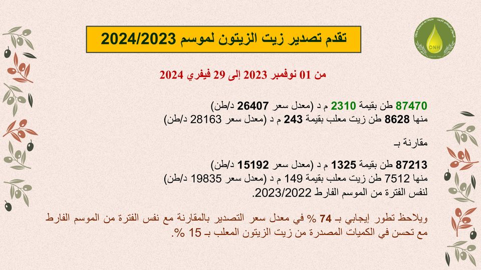 وحسب أرقام الديوان الوطني لزيت الزيتون فقد تم تصدير 87470 طن من الزيت بقيمة 2310 مليون دينار بمعدل 26407 دينار للطن الواحد منها 8628 طن زيت معلب بقيمة 243 مليون دينار بمعدل 28163 دينار للطن الواحد في الفترة الممتدة من 01 نوفمبر 2023 إلى 29 فيفري 2024.