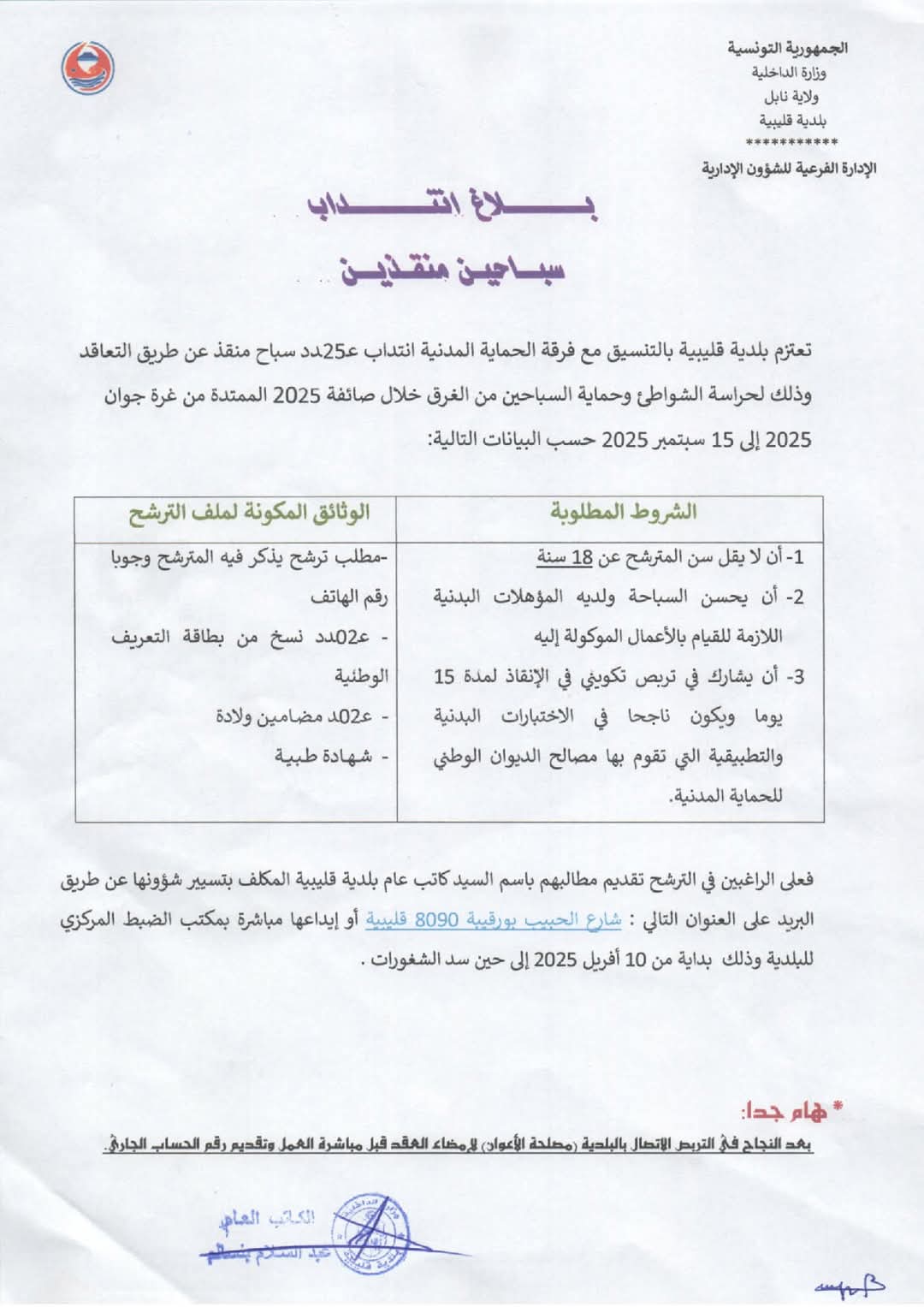 نشرت بلدية قليبية على صفحتها الرسمية اليوم الثلاثاء، 1 جويلية 2025، بلاغ انتداب 25 سباحا منقذا قصد سدّ الشغور.