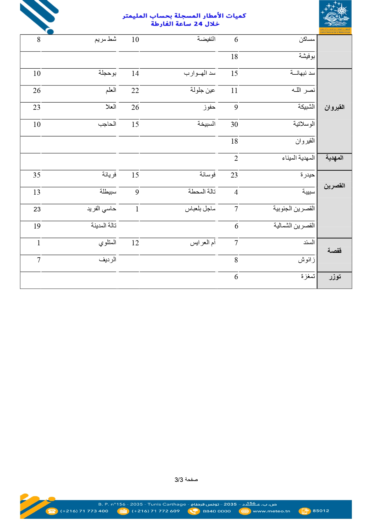 أخبار وطنية كميات الأمطار المُسجّلة خلال الـ24 ساعة الأخيرة بمختلف جهات البلاد