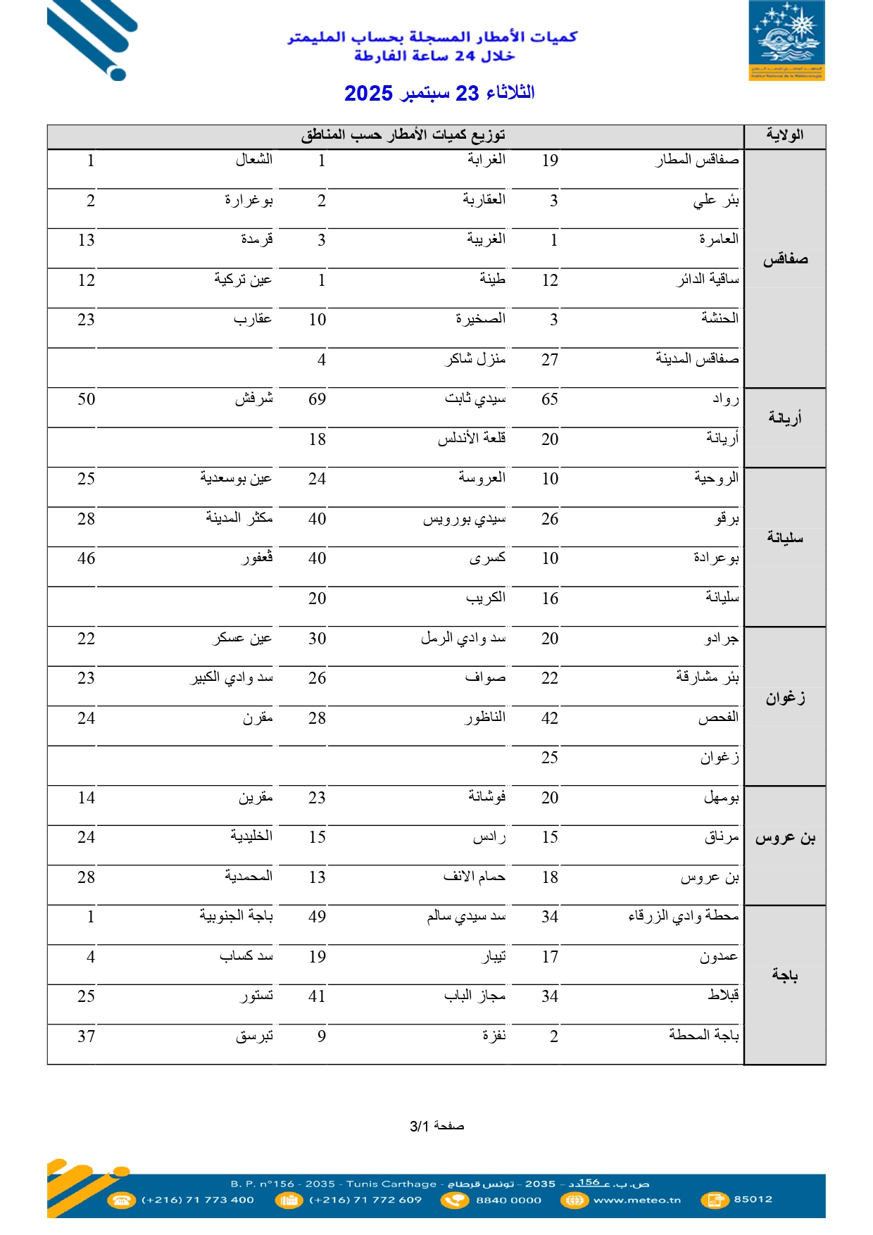 شهدت العديد من مناطق البلاد خلال الأربع وعشرين ساعة الماضية (من الساعة 07 ليوم الاثنين 22 سبتمبر إلى الساعة 07 ليوم الثلاثاء 23 سبتمبر 2025) تساقط كميات متفاوتة من الأمطار .