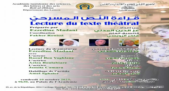 بمشاركة ثلة من المسرحيين التونسيين، يحتضن المجمع التونسي للعلوم والآداب "بيت الحكمة" يوم الجمعة 10 أكتوبر الجاري على الساعة التاسعة والنصف صباحا ندوة فكرية حول "قراءة النص المسرحي" يأثثها كل من الفنانين رؤوف بن يغلان، عزيزة بولبيار، جميلة كمارا.