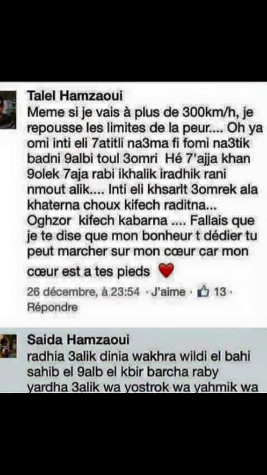 في واحدة من آخر تدويناته، عبر الشاب طلال حمزاوي، الذي غيبه الموت بعد حادث جدّ خلال مشاركته في رالي القمر، بتاريخ 26 ديسمبر عن حبه الشديد وتعلقه بأمه.