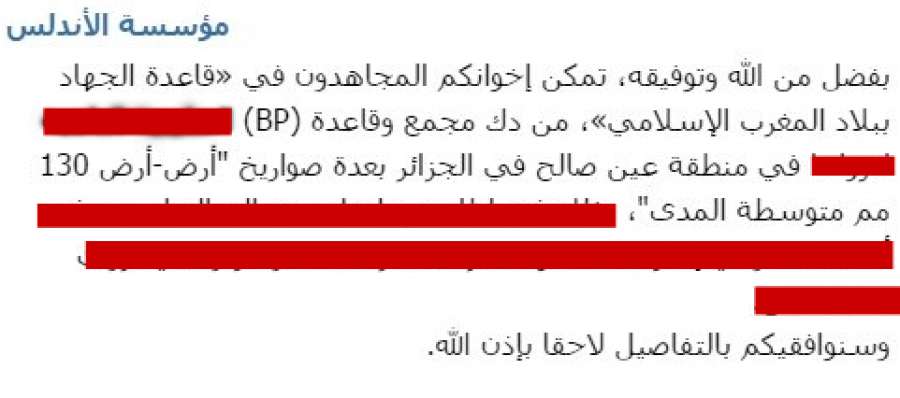 اعلنت “مؤسسة الاندلس” الجناح الاعلامي لما يسمى ” تنظيم القاعدة في بلاد المغرب الاسلامي” عن تبني التنظيم للعماية التي جدت صباح اليوم الجمعة 16 مارس 2016 في المجمع النفطي في عين صالح بالجزائر.