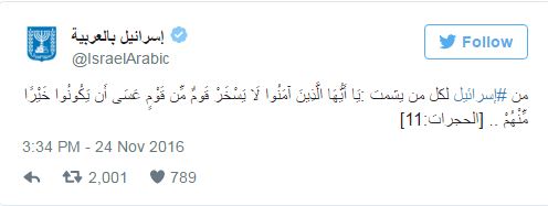 وثارت موجة من التعليقات الساخرة من قبل المغردين العرب على تغريدة الحساب الإسرائيلي جاء في بعضها لقطات فكاهية ساخرة من استشهاد الجانب الإسرائيلي بآية قرآنية في وقت يرتكب فيه الاحتلال انتهاكات واسعة بحق الأديان في فلسطين وتسعى إلى منع الآذان في المساجد بالأراضي الفلسطينية.