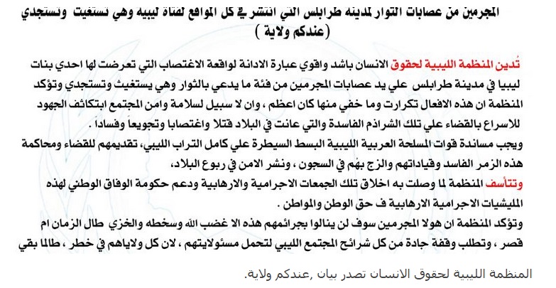 أصدرت المنظمة الليبية لحقوق الانسان في بنغازي بيانا تحصلت وكالة عروس البحر للأنباء على نسخة منه، كشفت فيه وأدانت اغتصاب عدد من النساء على يد المليشيات المسلحة في العاصمة طرابلس على يد ماسمتهم بالشراذم الفاسدة. وهذا نص بيان المنظمة: