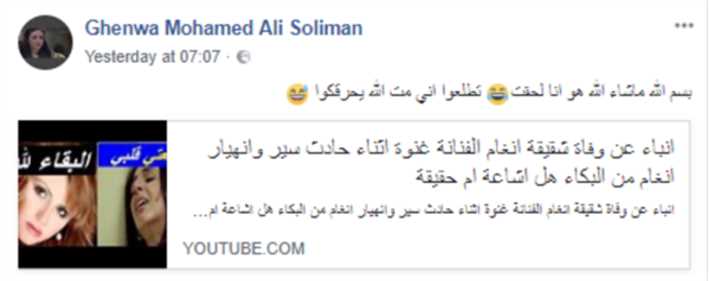 13- في مايو 2018 انتشرت أخبار عن تعرض غنوة لحادث سير أودى بحياتها ووقتها سخرت من الموضوع.
