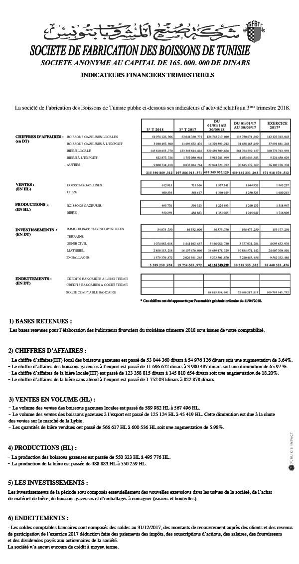 La Société de Fabrication des Boissons de Tunisie publie ses indicateurs d'activité relatifs au troisième trimestre 2018: