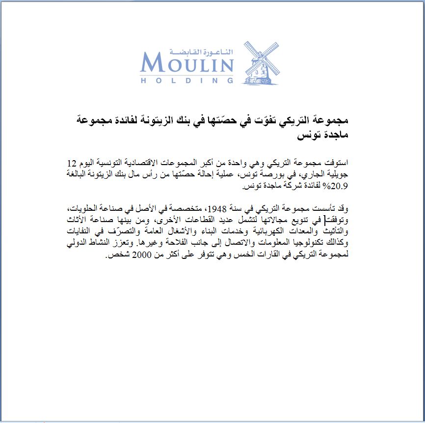 أنهت مجموعة التريكي إحالة حصتها في بنك الزيتونة لفائدة الفرع التونسي لمجموعة ماجدة القطرية والبالغة 20.903 بالمائة بقيمة 111.88 مليون دينار ليصبح بذلك بنك الزيتونة 100 بالمائة قطري، وفق ما ذكره موقع البورصة ILBOURSA.COM.