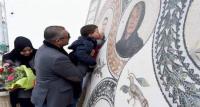 صورة اليوم: ابن الشهيد أيمن مرجان يقبل صورة والده الفسيفسائية